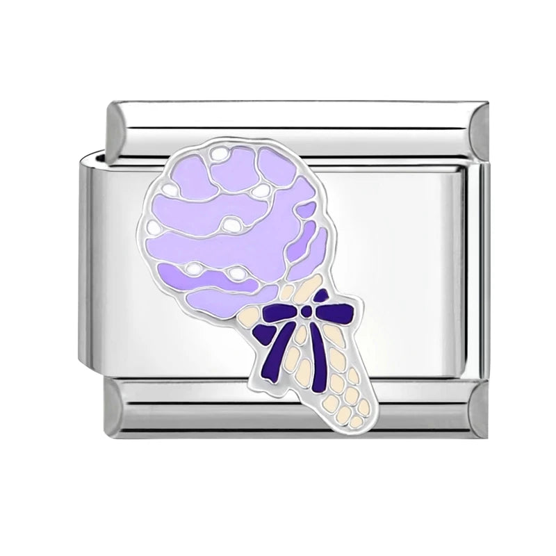 Stříbrný "Charm" z nerezové oceli s fialovou zmrzlinou a mašlí.