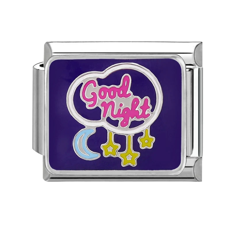Stříbrný "Charm" z nerezové oceli s nápisem Good Night na mráčku na fialovém podkladu.