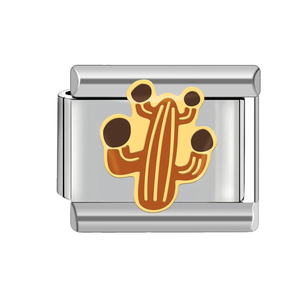 "Charm" z nerezové oceli ve stříbrné barvě s hnědým kaktusem.