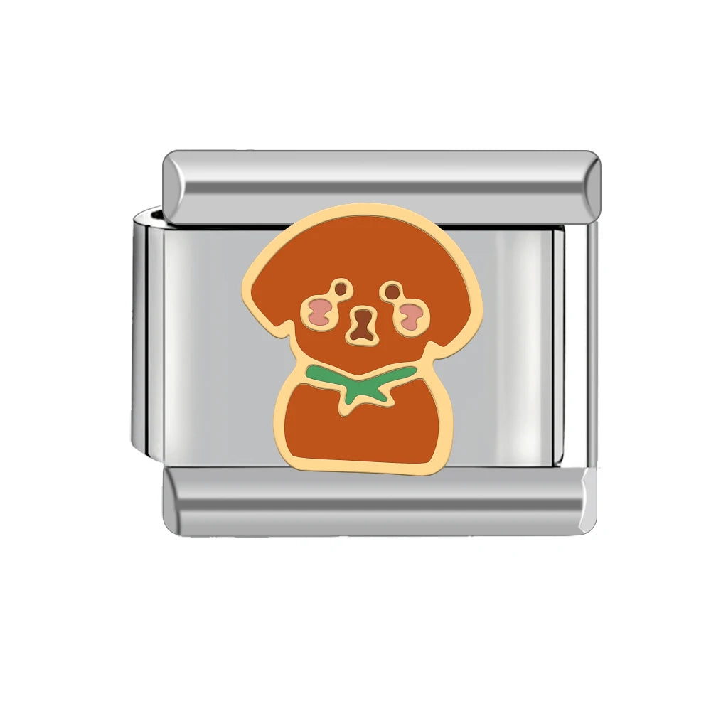 Stříbrný "Charm" z nerezové oceli s hnědým pudlem se zeleným obojkem.