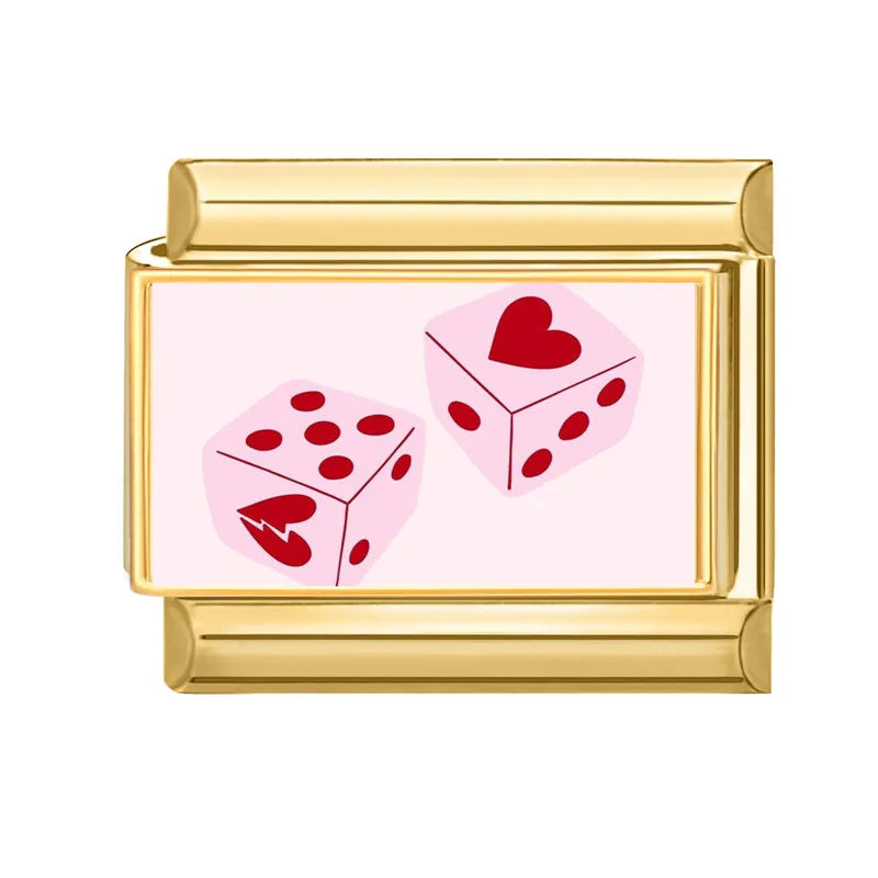 "Charm" z nerezové oceli ve zlaté barvě s růžovými kostkami se srdíčky.