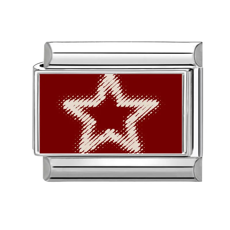 "Charm" z nerezové oceli ve stříbrné barvě s bílou hvězdou na rudém pozadí.