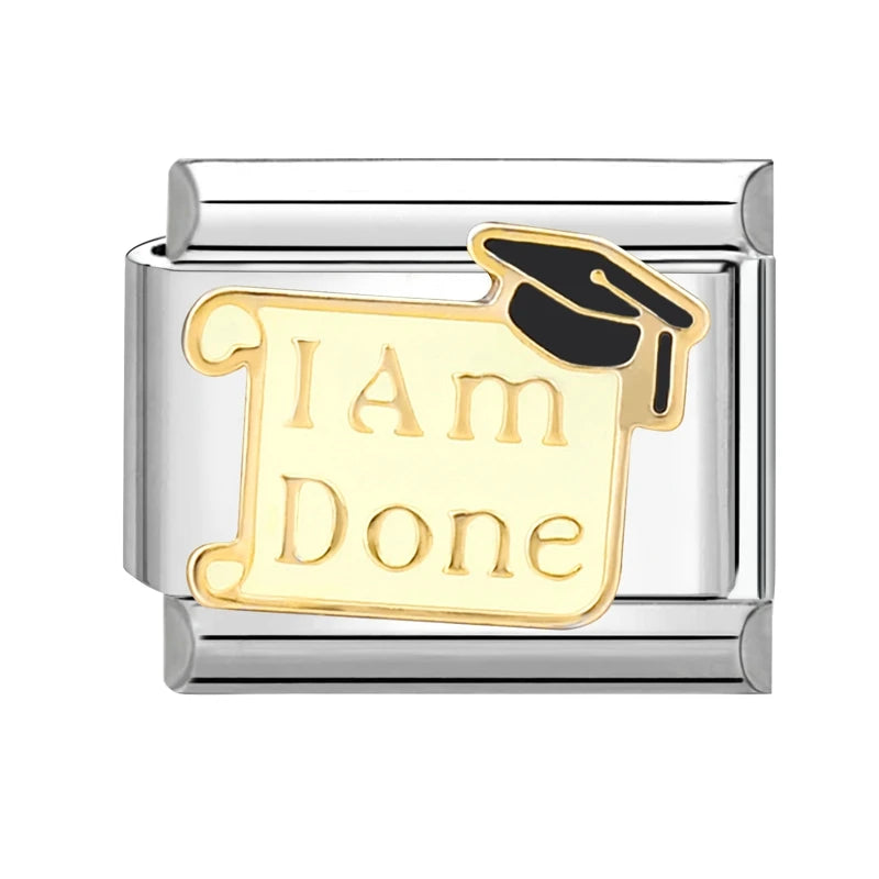 Stříbrný "Charm" z nerezové oceli s nápisem I am Done promoce.