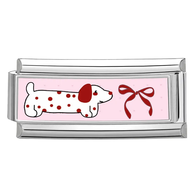 "Double Charm" z nerezové oceli s jezevčíkem a červenou mašlí na růžovém pozadí.