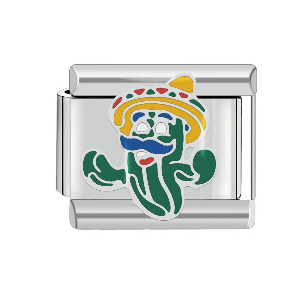 Stříbrný "Charm" z nerezové oceli s kaktusem s kloboukem a úsměvem.