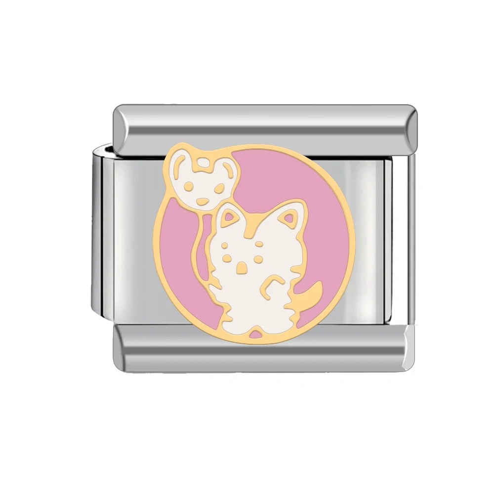Stříbrný "Charm" z nerezové oceli s kočkou s balónem v růžovém kruhu.