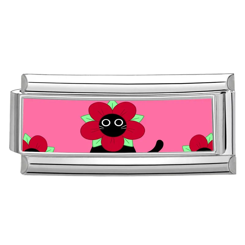 "Double Charm" z nerezové oceli s černou kočkou v převleku květiny na růžovém pozadí.