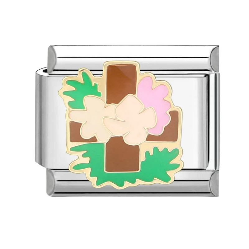 Stříbrný "Charm" z nerezové oceli s křížem s květinami.