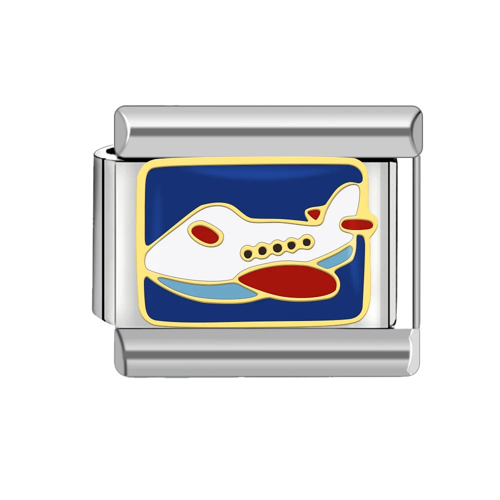 Stříbrný "Charm" z nerezové oceli s letadlem na modrém podkladu.