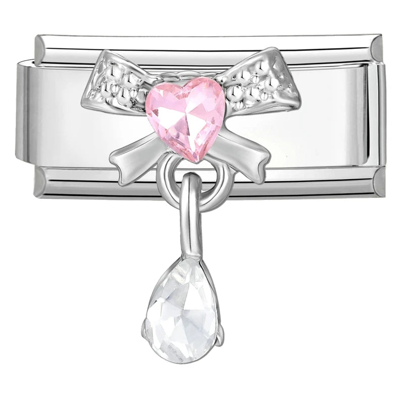 "Double Charm" z nerezové oceli s mašlí s růžovým kamínkem a visícím krystalem.