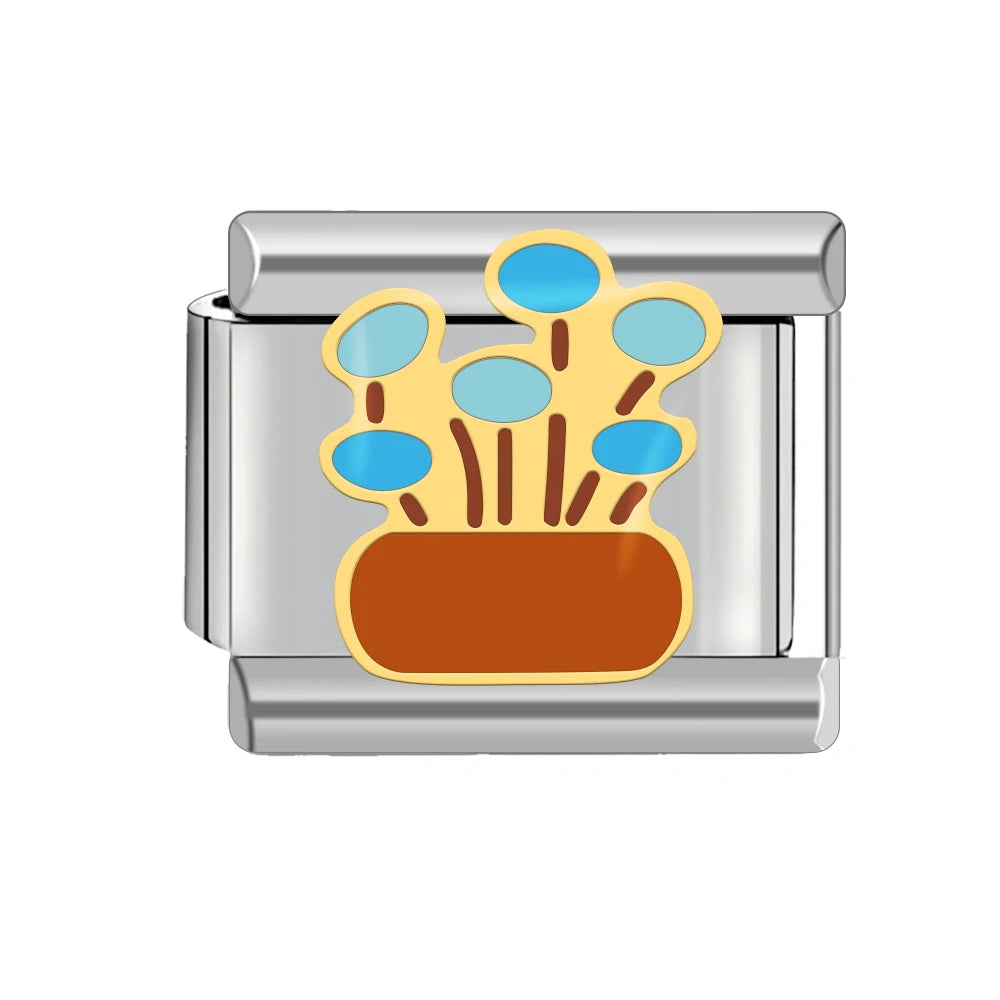 "Charm" z nerezové oceli ve stříbrné barvě s modrými květinami v květináči.