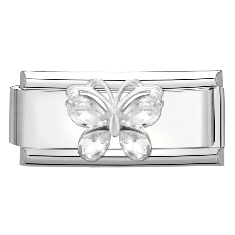 "Double Charm" z nerezové oceli s motýlem a se stříbrnými kamínky.