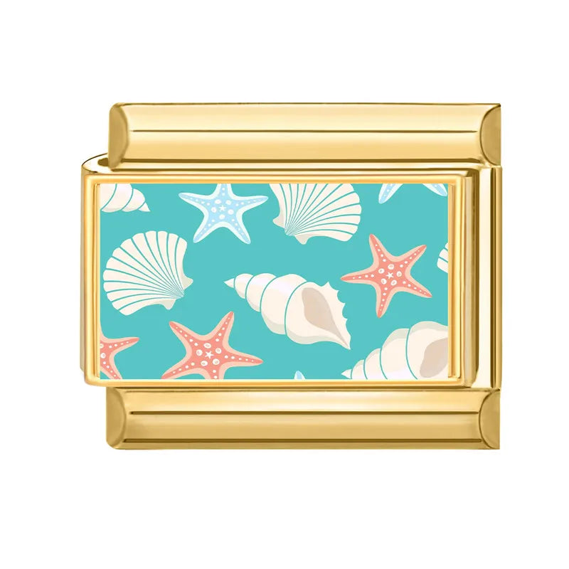 "Charm" z nerezové oceli ve zlaté barvě s mušlemi a mořskými hvězdami na tyrkysovém pozadí.