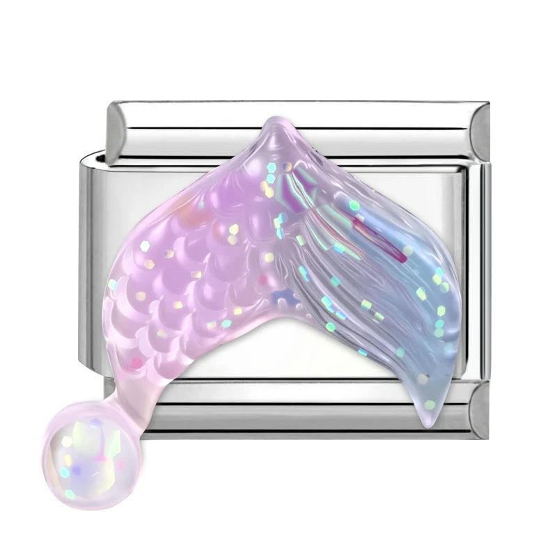 Stříbrný "Charm" z nerezové oceli s ocasem mořské panny v holografické barvě.