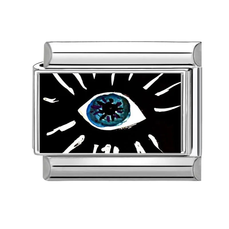 "Charm" z nerezové oceli ve stříbrné barvě s modrým okem na černém pozadí a s bílými paprsky.