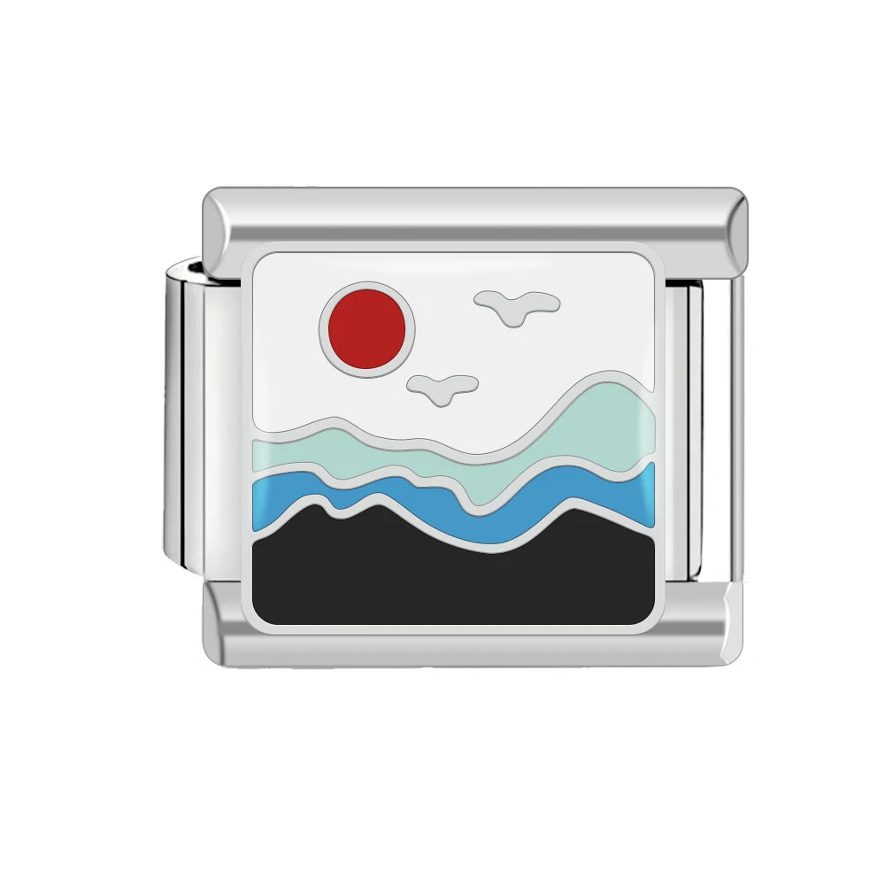Stříbrný "Charm" z nerezové oceli s panoramatem moře a slunce.