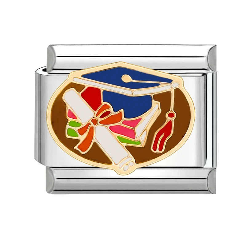 Stříbrný "Charm" z nerezové oceli s čepicí na promoce a knihami.