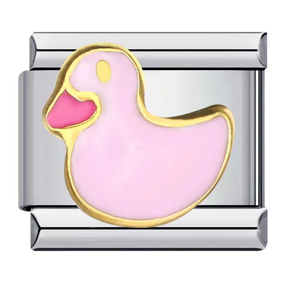 Stříbrný "Charm" z nerezové oceli s růžovou kachničkou.