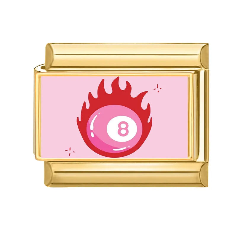 "Charm" z nerezové oceli ve zlaté barvě s růžovou koulí s číslem osm a s červenými plameny.