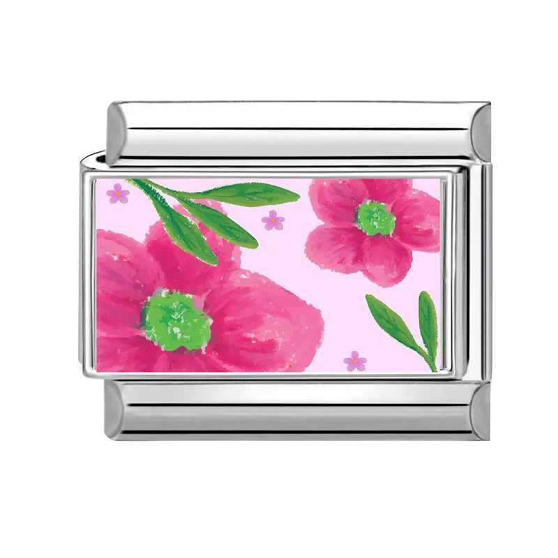 "Charm" z nerezové oceli ve stříbrné barvě s růžovými květinami a zelenými stonky na růžovém pozadí.
