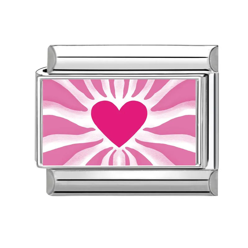 "Charm" z nerezové oceli ve stříbrné barvě s růžovým srdcem a růžovými paprsky.