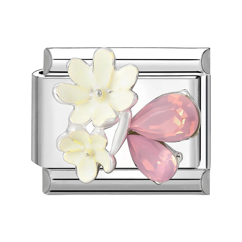 "Charm" z nerezové oceli ve stříbrné barvě s růžovým motýlem s béžovými květinami.