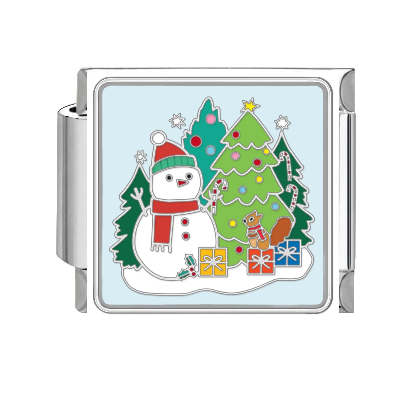 "Charm" z nerezové oceli ve stříbrné barvě se sněhulákem a vánočními stromky.