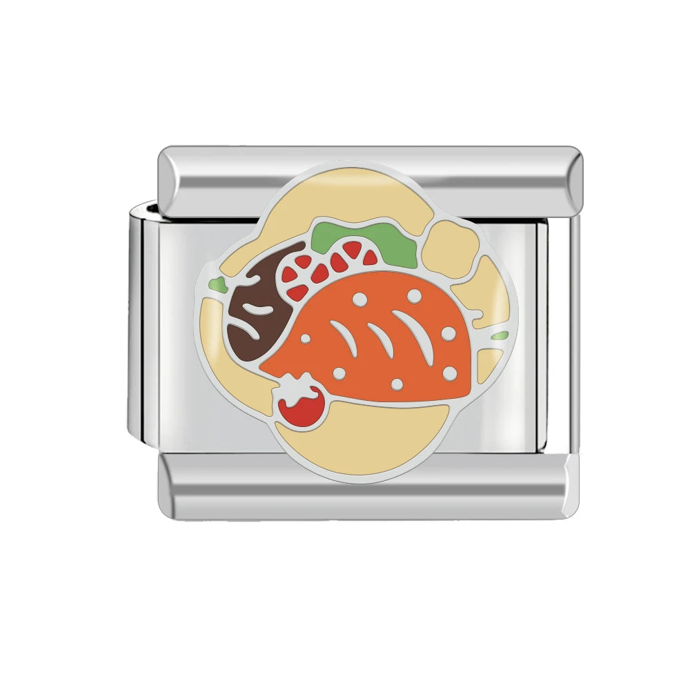 Stříbrný "Charm" z nerezové oceli s tacos na žlutém podkladu.