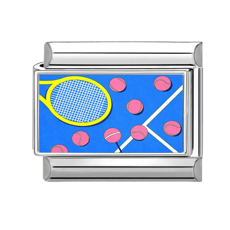 "Charm" z nerezové oceli ve stříbrné barvě s tenisovou raketou, míčky a tenisovým kurtem.
