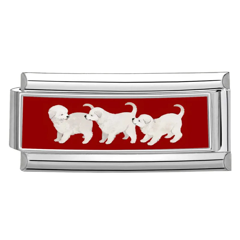 "Double Charm" z nerezové oceli s obrázkem třech štěňat na červeném pozadí.