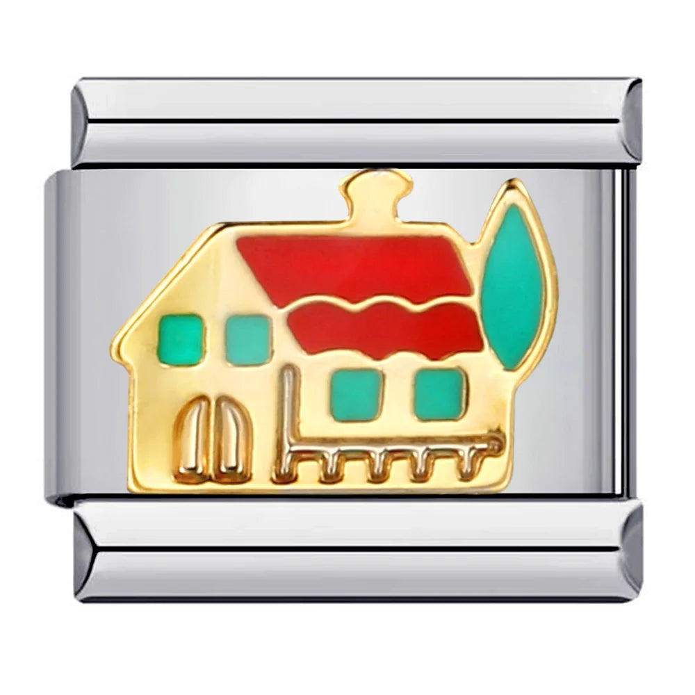 "Charm" z nerezové oceli ve stříbrné barvě s vánočním domkem.