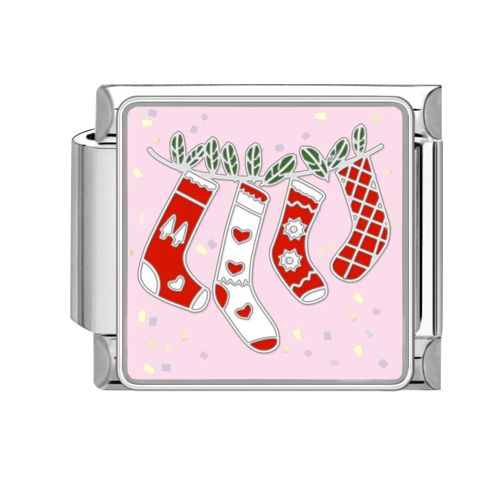 "Charm" z nerezové oceli ve stříbrné barvě s vánočními ponožkami na růžovém pozadí.