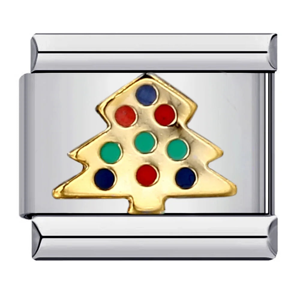 "Charm" z nerezové oceli ve stříbrné barvě se zlatým vánočním stromem a ozdobami.