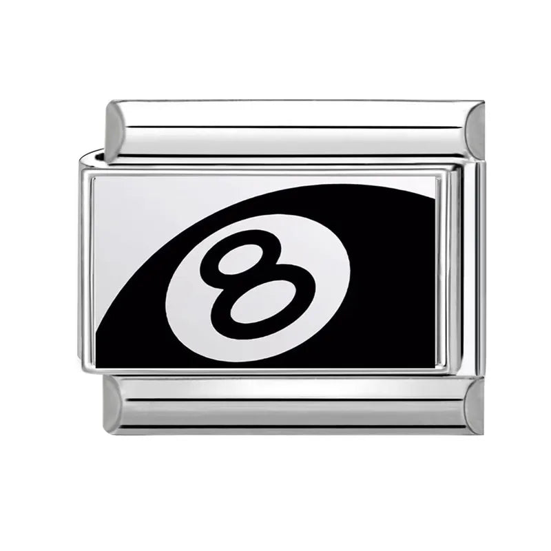 "Charm" z nerezové oceli ve stříbrné barvě s velkou černou koulí s číslem 8.