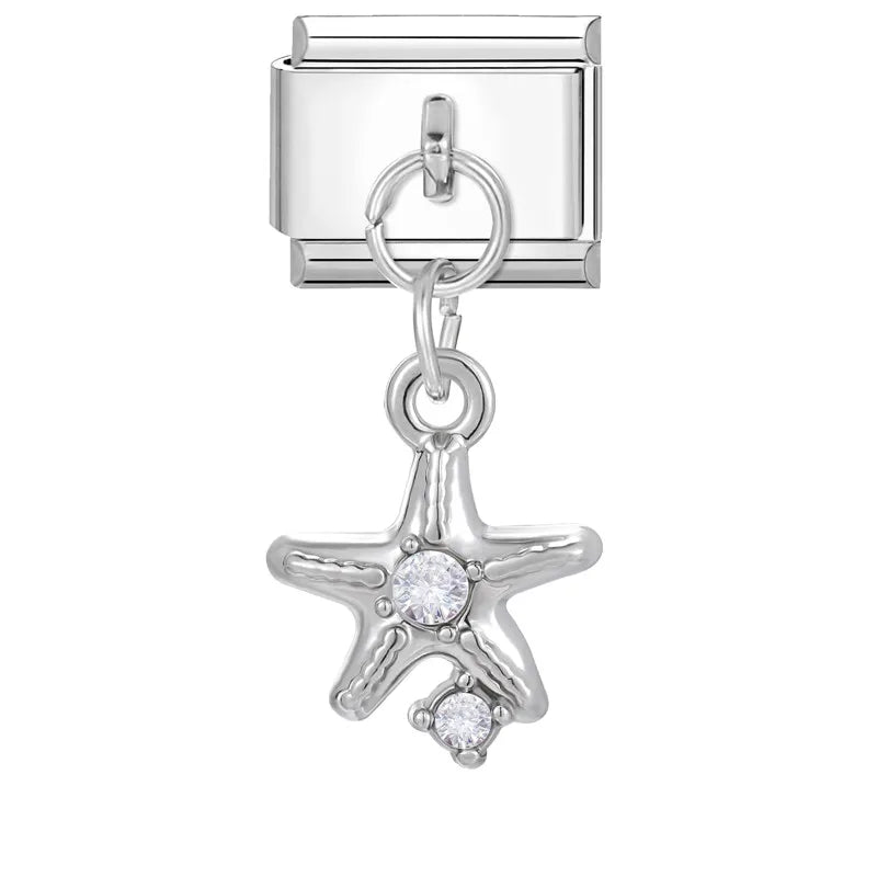 Stříbrný visící "Charm" z nerezové oceli s mořskou hvězdou a dvěma krystaly.