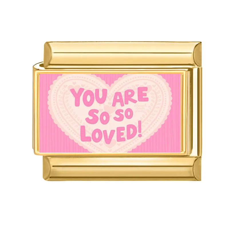 "Charm" z nerezové oceli ve zlaté barvě se srdíčkem a růžovým textem "You are so so loved".