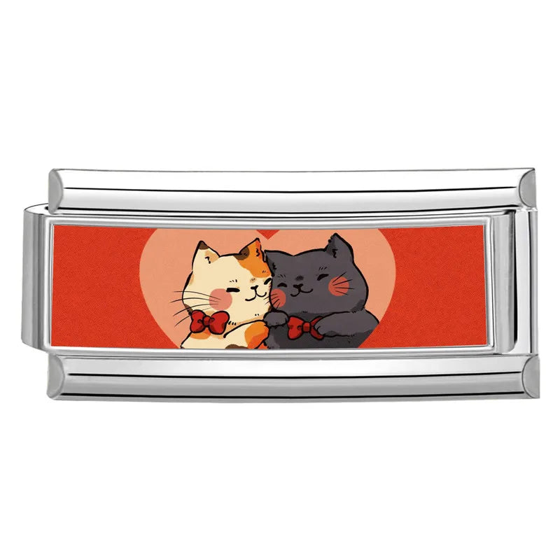 "Double Charm" z nerezové oceli s kočkami v obětí na červeném pozadí.