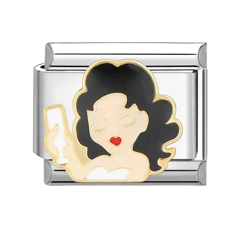 Stříbrný "Charm" z nerezové oceli s ženou se skleničkou a bílými šaty.