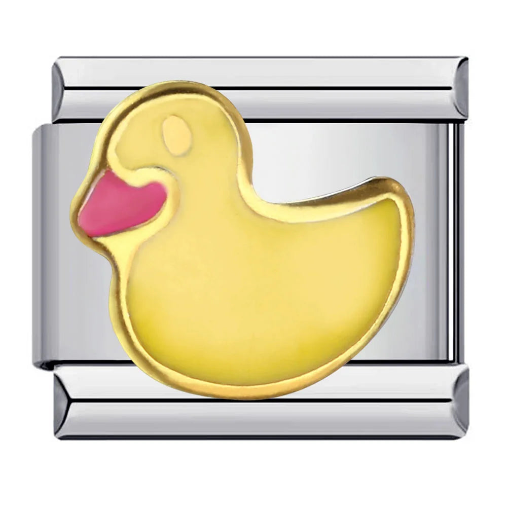 Stříbrný "Charm" z nerezové oceli se žlutou kachničkou.