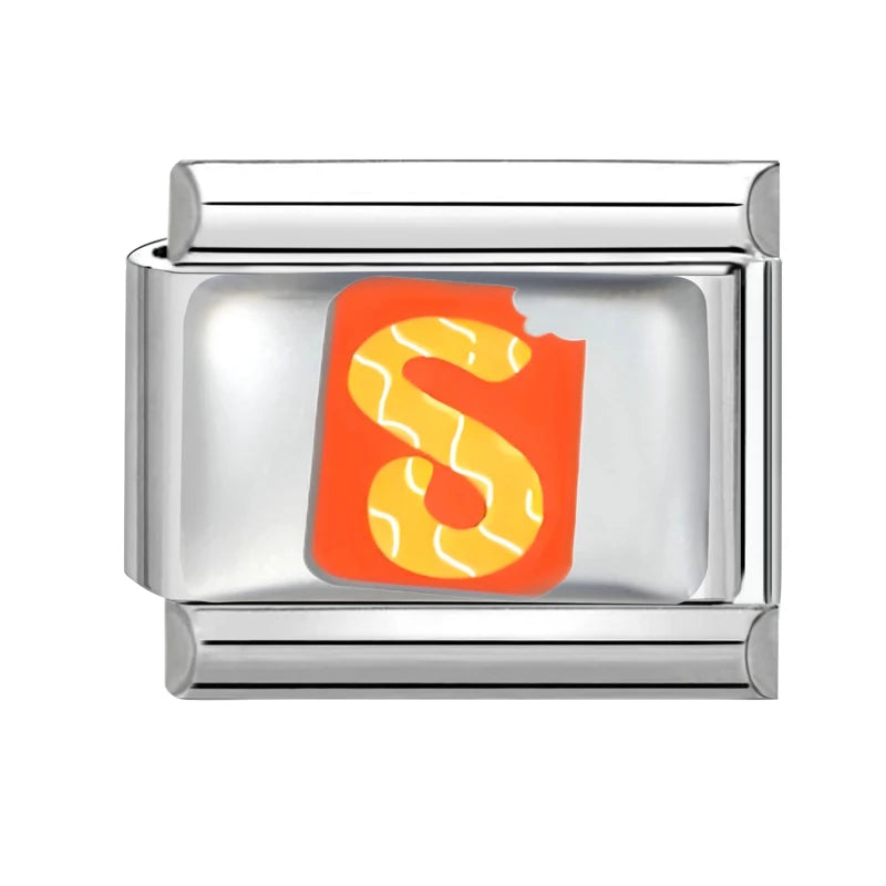 "Charm" z nerezové oceli ve stříbrné barvě se žlutým písmenem S na oranžovém pozadí.